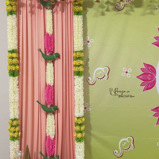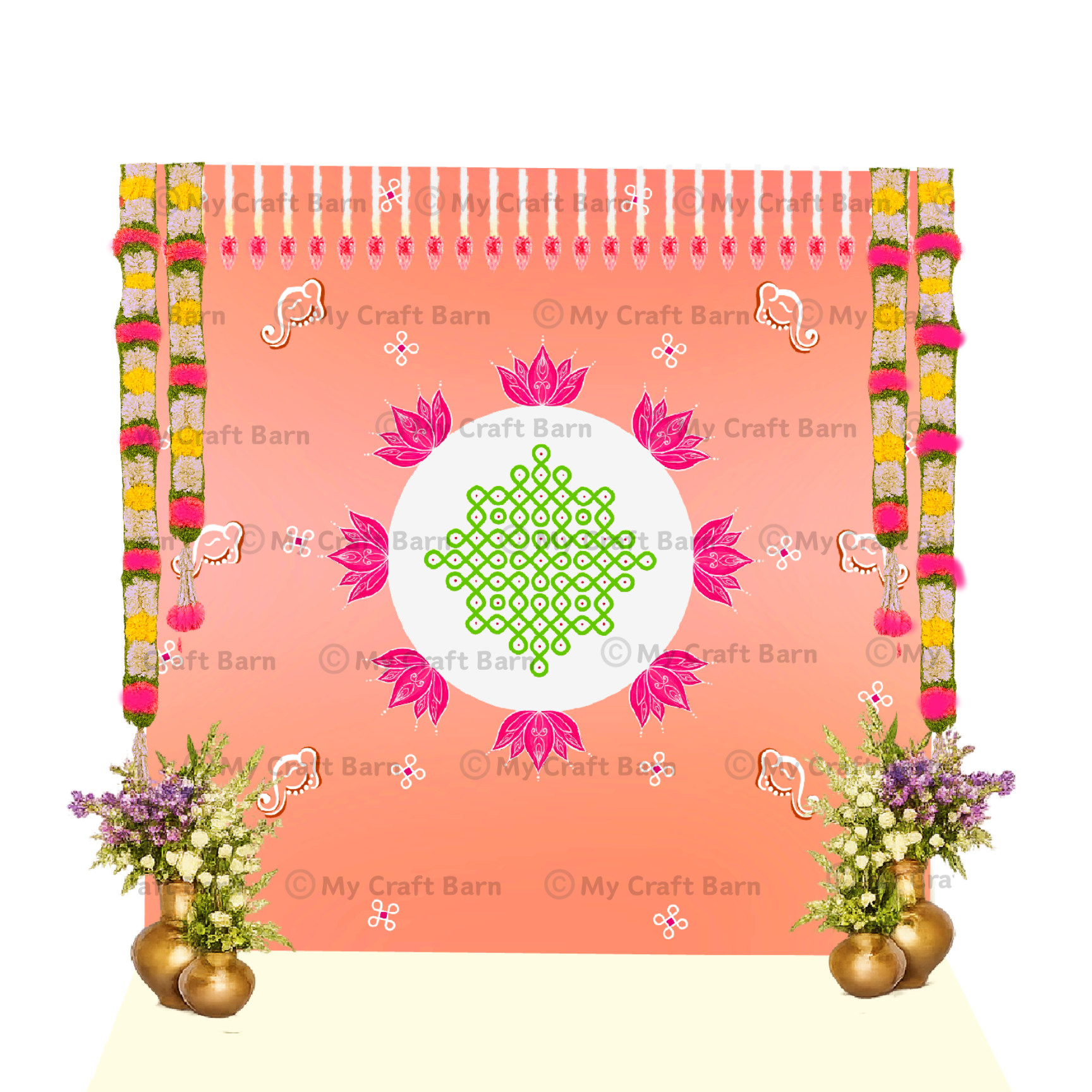 This backdrop is inspired by traditional South Indian celebration decor, designed to bring an auspicious and serene presence to your special occasion. The artwork features a central kolam-style pattern, symbolizing prosperity and positivity, surrounded by lotus motifs, lord ganesh elements, and classic decorative borders.