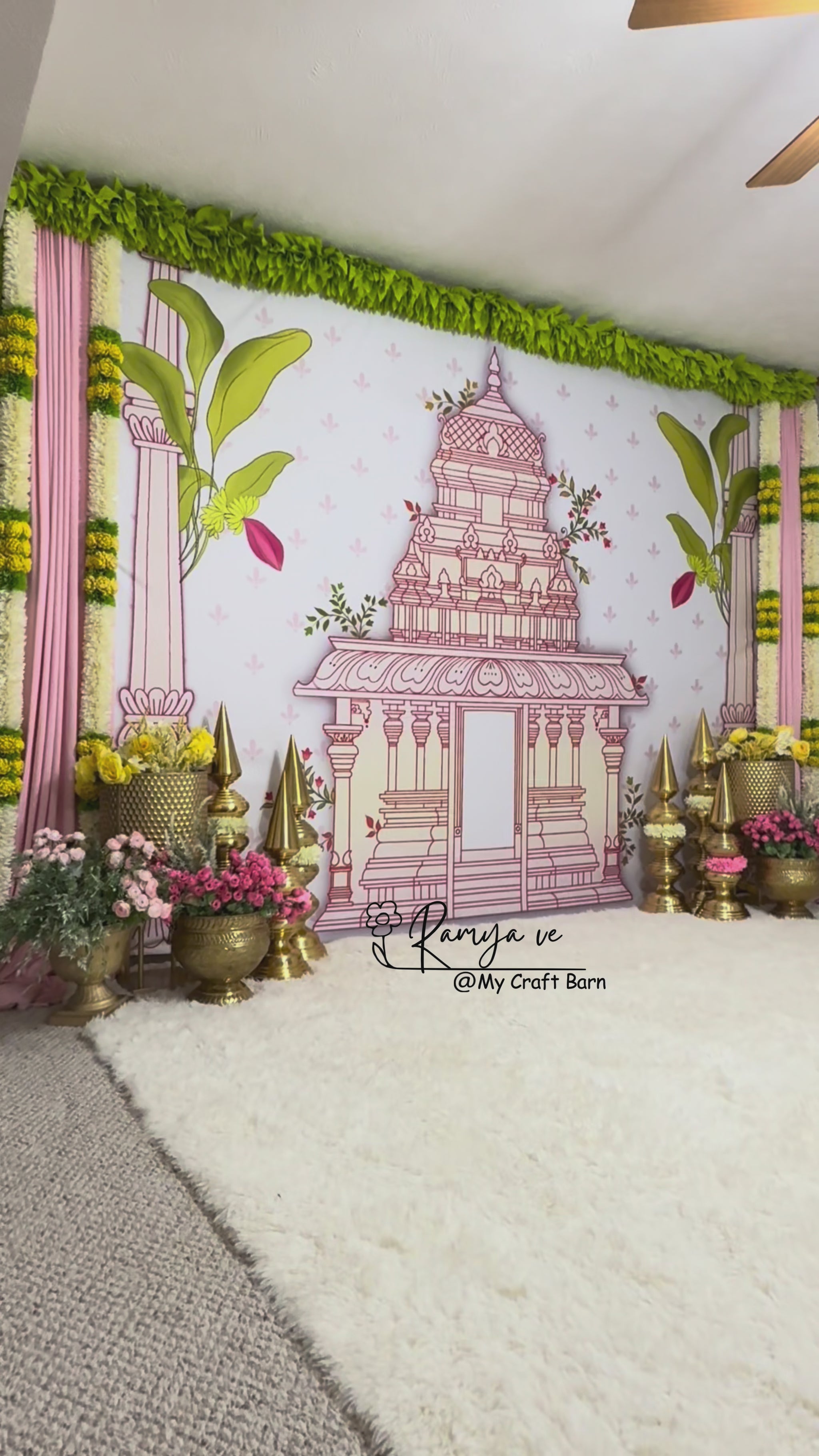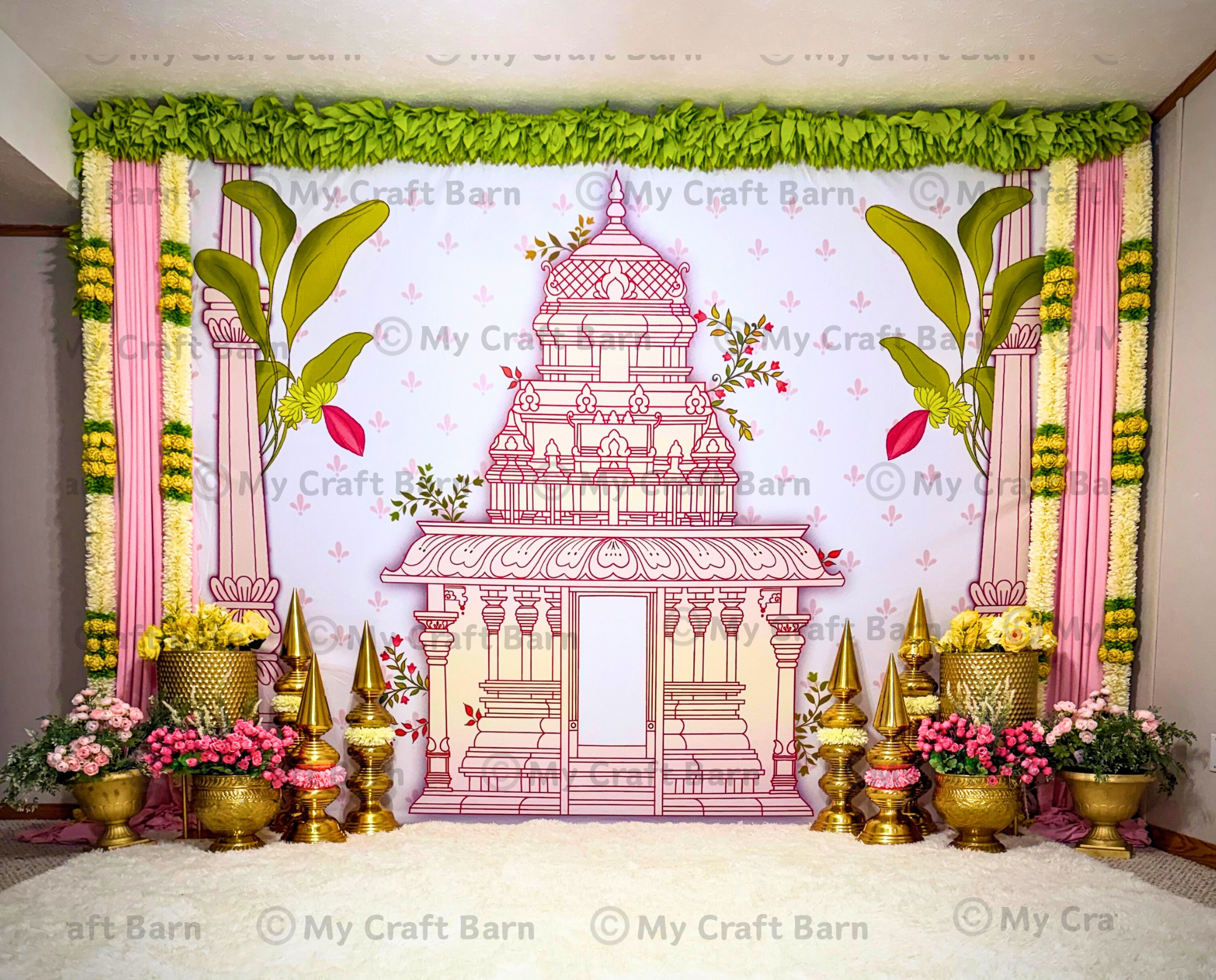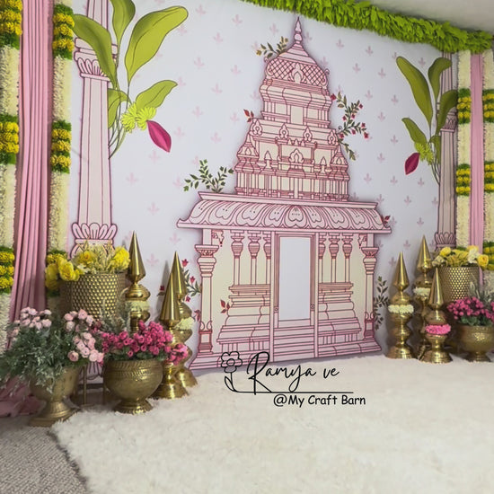 Bring a serene South Indian temple aesthetic to your celebrations with this South Indian Temple Backdrop Cloth, designed in soft pastel pink tones with traditional banana leaf and floral detailing.